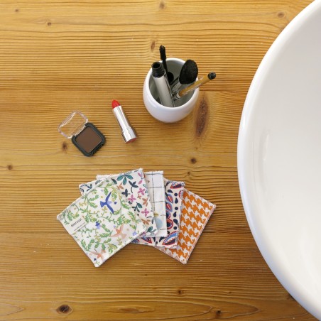Les carrés sont confectionnés dans notre atelier de Haute-Savoie. Ils sont vendus par lot de 5, seuls ou accompagnés d'un filet de rangement. Nous vous proposons également une sélection de carrés démaquillants à petits défauts, et donc à petits prix !