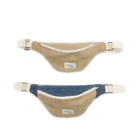 Le modèle en jute revalorise des sacs à grains de café, seul ou accompagné d'une touche de jeans upcyclé.
